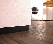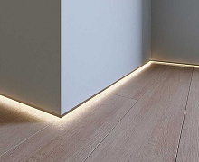 Особенности монтажа: Уложите ламинат так, чтобы его край заходил под будущий профиль, но не упирался в стену. Нанесите «жидкие гвозди» зигзагом на тыльную сторону профиля. Приклейте профиль к ровной стене прямо поверх ламината. Заштукатурьте верхнюю кромку профиля, чтобы она слилась со стеной. Зашпаклюйте и покрасьте стену как обычно.